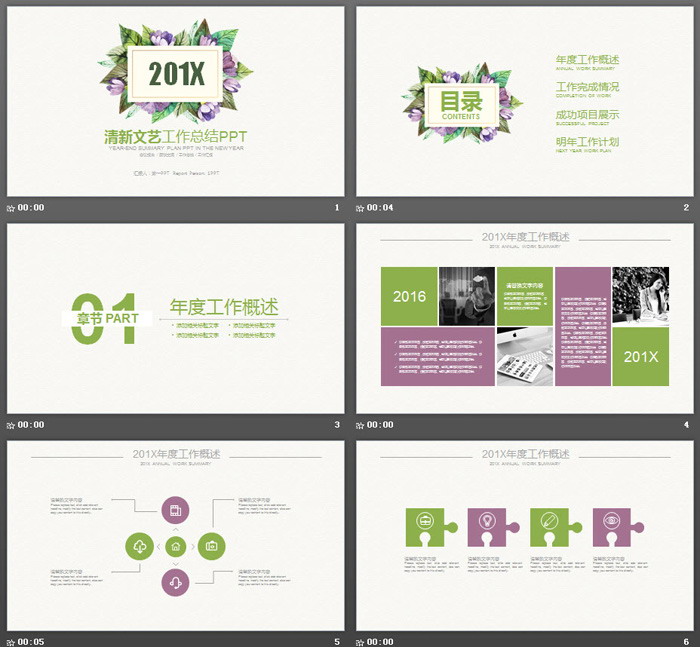 PPT模板内容页面,使用了绿色与紫色搭配,设计了20张扁平化幻灯片图表。个人感觉清新典雅。