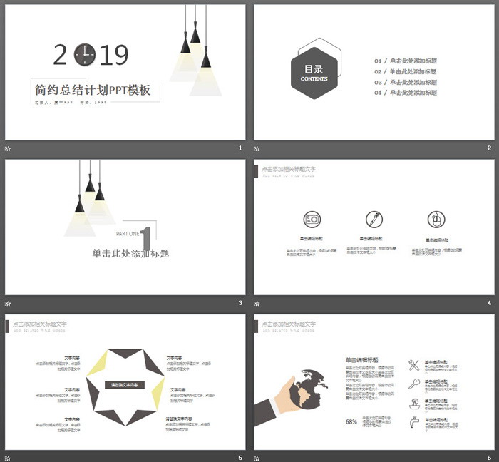 幻灯片模板使用了钟表与吊灯作为封面设计元素。简洁简约充满艺术气息。