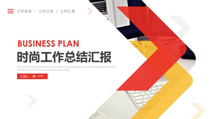 幻灯片模板封面,使用了红色与黄色箭头搭配办公场景图片作为背景。左侧用红色与黑色字体填写工作汇报幻灯片标题。简洁清新。