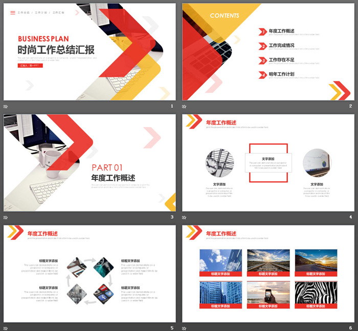 PowerPoint模板内容页面,使用了红色黄色黑色三色搭配设计。制作了24张扁平化幻灯片图表。其中使用了多张职场、商业建筑、自然风景、动物图片作为装饰。
