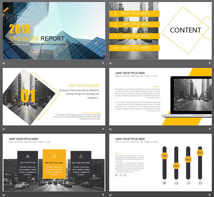 PPT模板内容页面,使用了黄色与灰色搭配设计,其中使用了多张欧美建筑、街景作为背景。