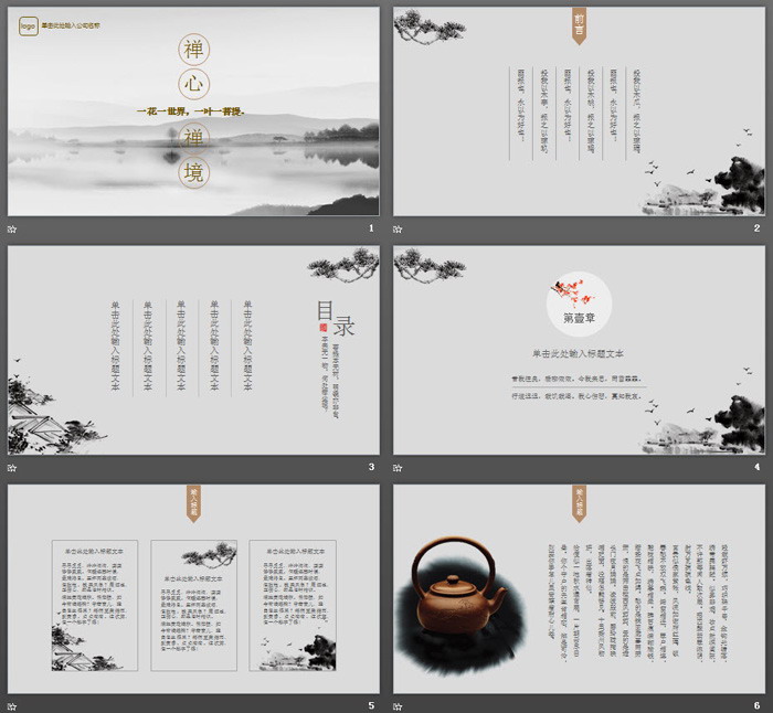 幻灯片模板使用了淡雅水墨山水画作为背景,搭配金色圆圈框起来的禅心、禅境文字,很好的体现禅意主题。