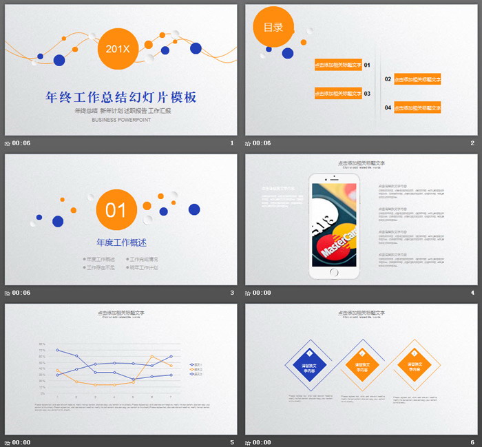 这是一套橙色蓝色搭配简洁年终工作总结PPT模板,共22张。