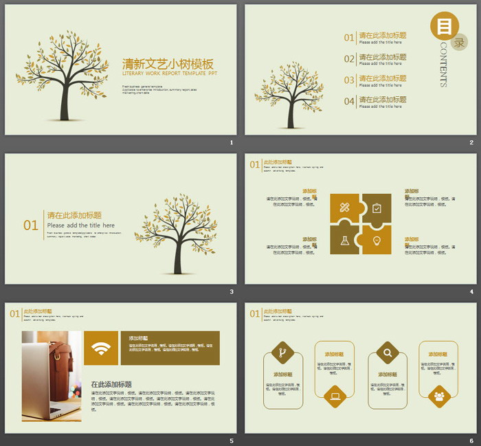 这是一套清新文艺风格的,插画小树背景艺术设计PPT模板,共25张。