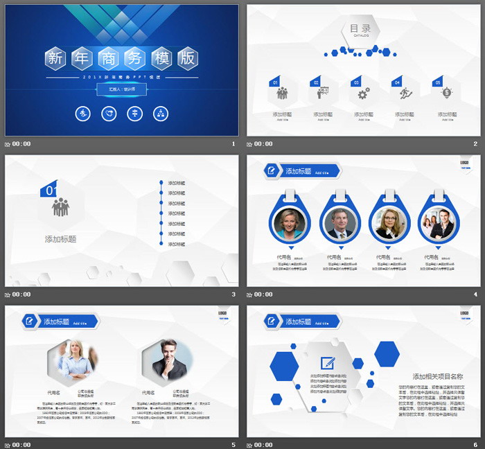 PPT模板内容页面,使用了灰色与蓝色搭配,设计了23张微立体风格的幻灯片图表,非常实用。