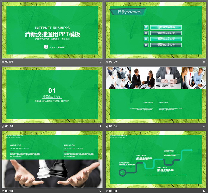 这是一套绿色叶子背景的,精美商务PPT模板,共22张。