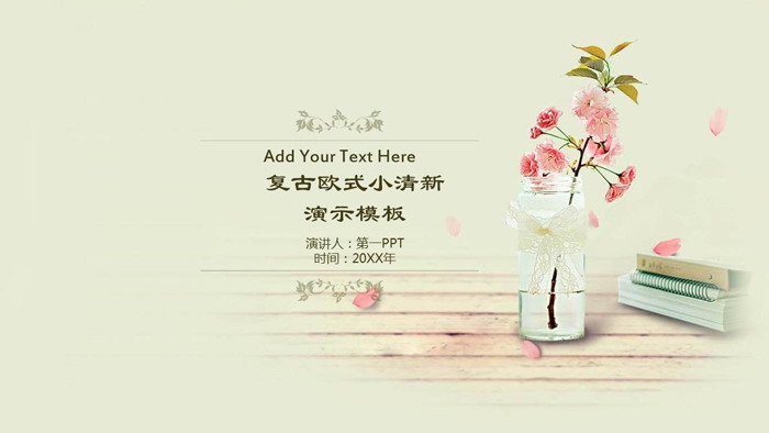 幻灯片模板使用了淡雅清新绿色作为背景色,使用复古样式的花纹图案作为背景图片。PPT首页,使用了一张摆放花瓶、花卉、书籍的桌面作为背景,小资唯美。