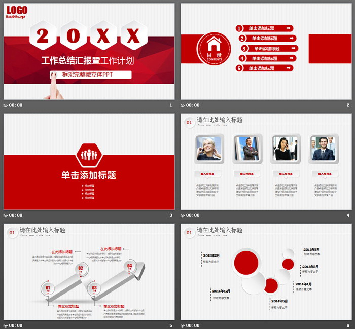PowerPoint模板内容页面,使用了多张商务人物照片、企业团队照片、项目介绍图片进行排版制作。PPT自带了23张红色微立体图表。
