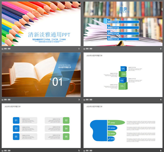 PowerPoint模板内容页面,使用了蓝色与绿色搭配,设计了20张幻灯片图表。幻灯片模板使用了多张图书馆、图书、书籍作为排版素材。与教育行业主题贴切。
