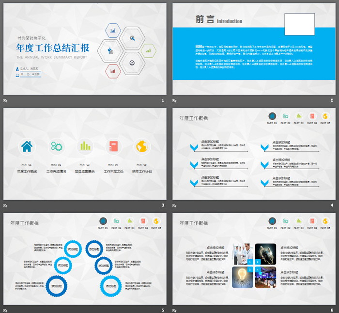 关键词:蓝色简洁PPT模板,细线六边形幻灯片背景,精致年度工作总结PPT模板,.PPTX格式;
