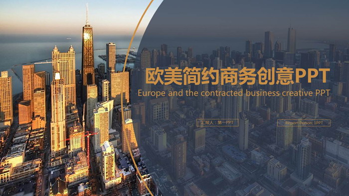 幻灯片模板封面使用了图片排版样式设计,一张夕阳下的欧美发达城市作为背景图片。右侧使用半圆形的半透明图形作为填写PPT标题的文本框;