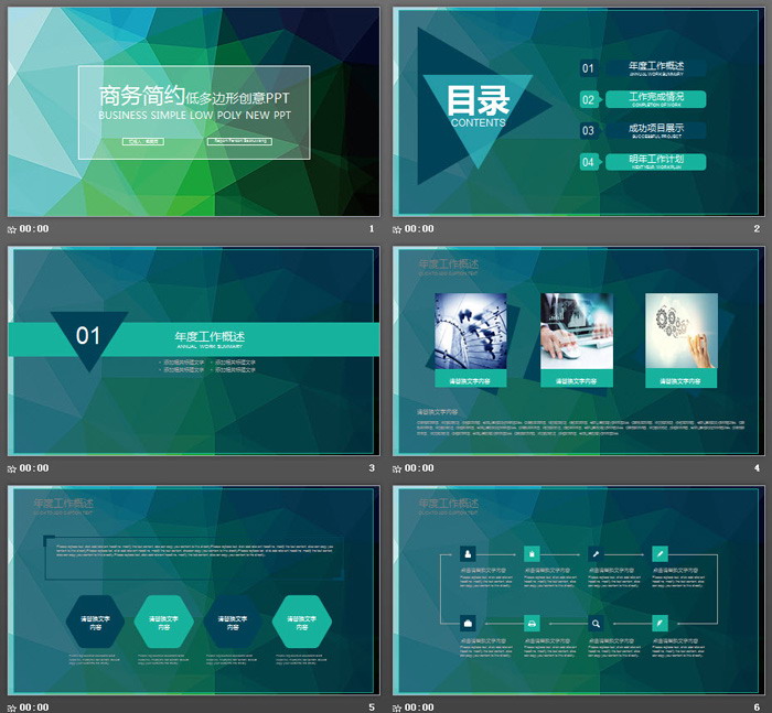 这是一套绿色简洁低平面多边形PPT模板,共22张;