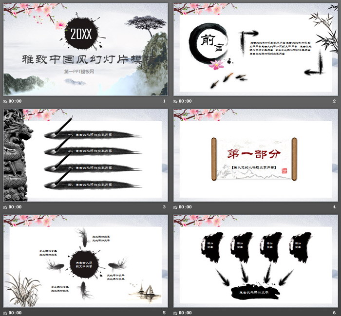 PowerPoint模板内容页面,由25张水墨PPT图表制作。另外使用了墨迹、毛笔书写动画、水墨竹子、兰花、金鱼、梅花、古典折扇、动态卷轴动画作为点缀。