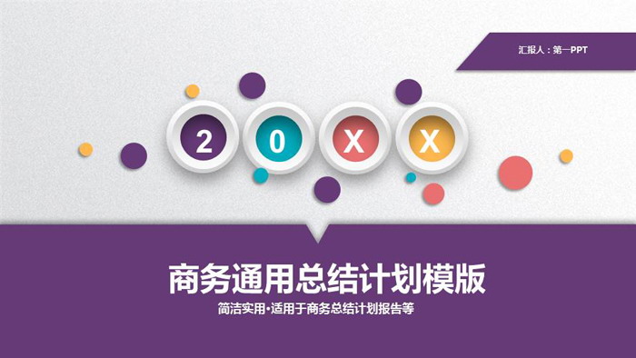 幻灯片模板封面,使用了彩色微立体圆点图案作为背景,在中间四个圆形上填写工作总结PPT年份,下方使用大面积紫色区域填写工作总结计划PPT标题。界面设计精致实用,几乎可以与任何行业匹配。