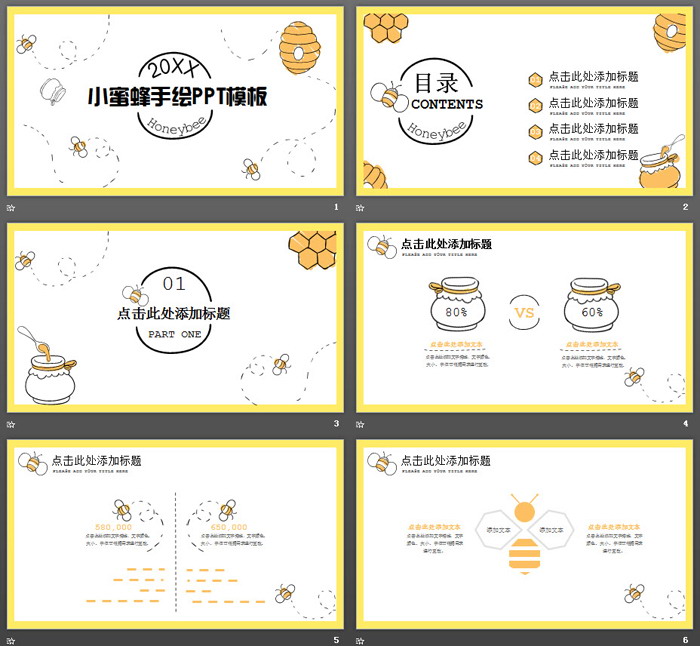PowerPoint模板内容页面,由蜂窝、蜜蜂、蜜罐等元素设计了23张卡通幻灯片图表。
