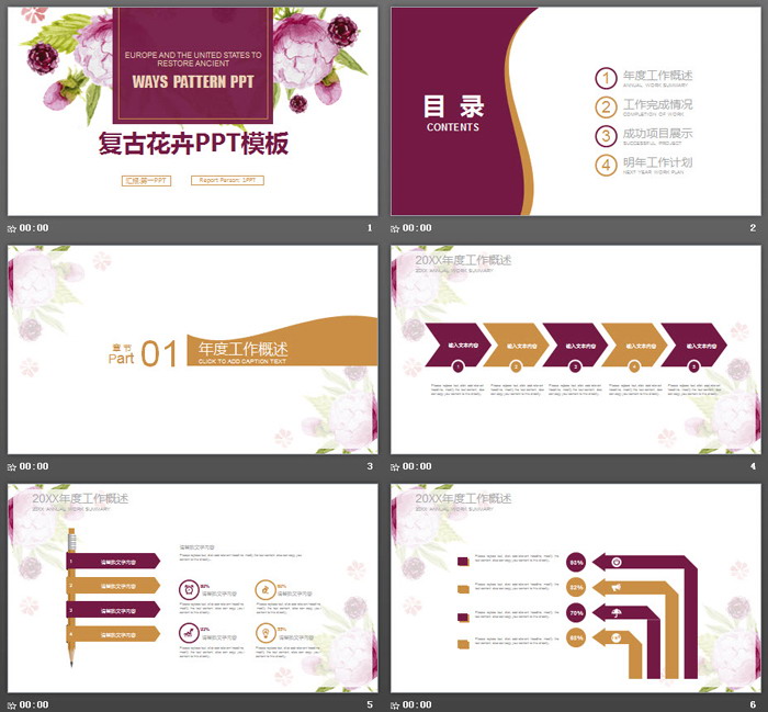 这是一套红色复古花卉背景的,艺术设计PPT模板,共21张;