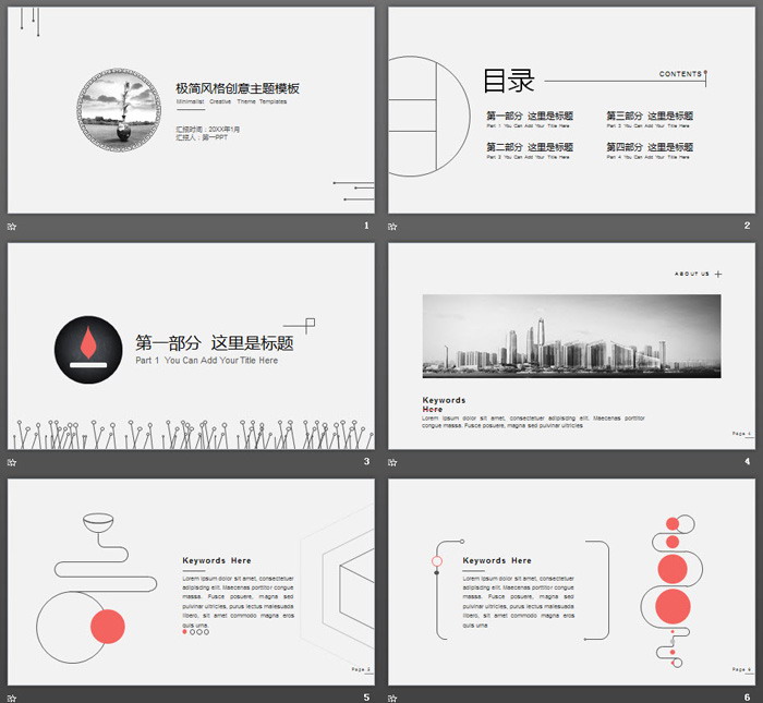 关键词:灰色细线风格幻灯片模板,简洁文艺PowerPoint模板免费下载,清新艺术设计PPT模板,.PPTX格式;
