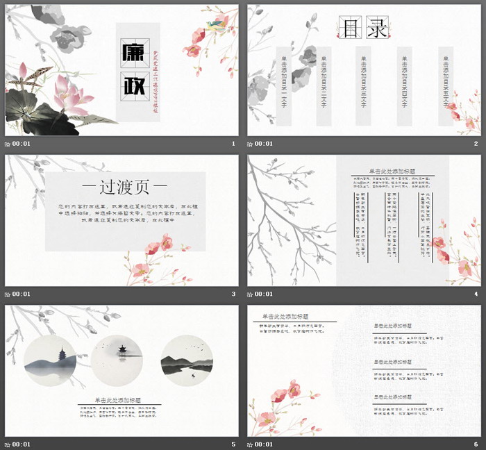 幻灯片模板封,使用了水墨莲花与粉色淡雅花卉作为背景图片。中间填写廉政PPT标题。界面设计清新古朴。