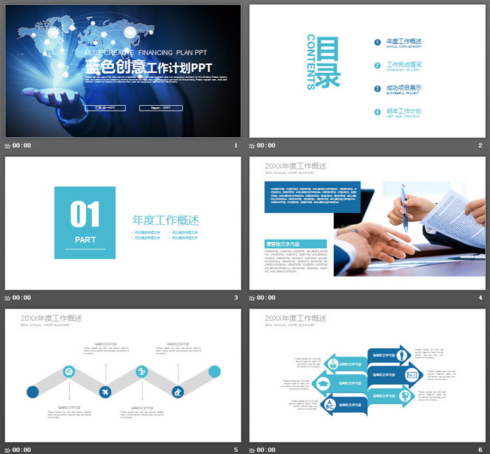 这是一套蓝色手势地图背景的,工作计划PPT模板,共22张;