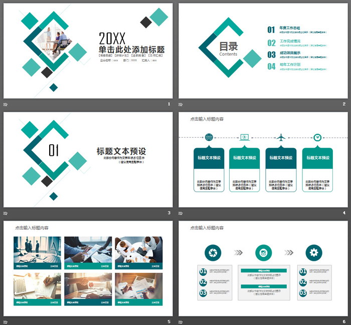 这是一套简洁绿色方块背景的,通用工作总结汇报PPT模板,共25张;