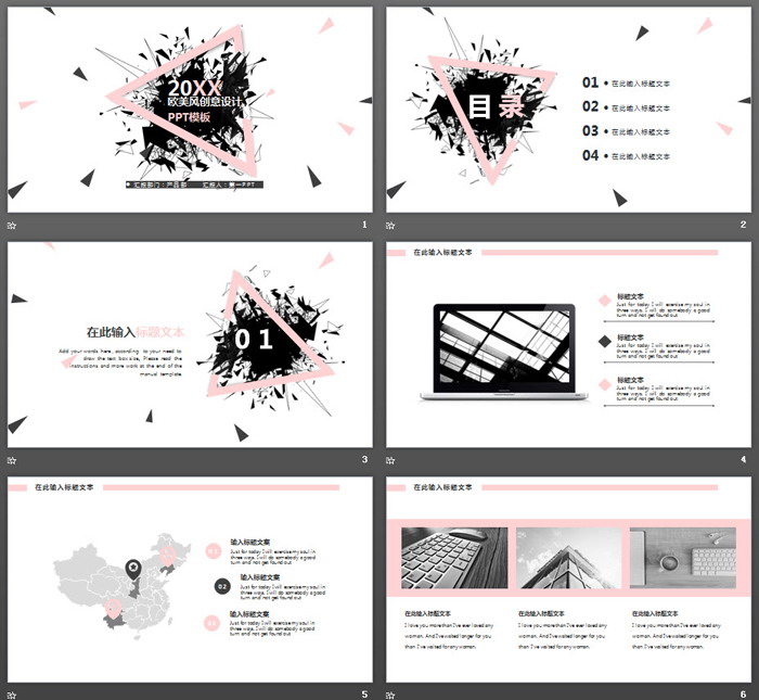 幻灯片模板封面,使用了粉色三角形、类似墨迹的黑色多边形作为PPT背景图片。在三角形中间填写演示幻灯片标题文字。界面设计个性且具有创意。