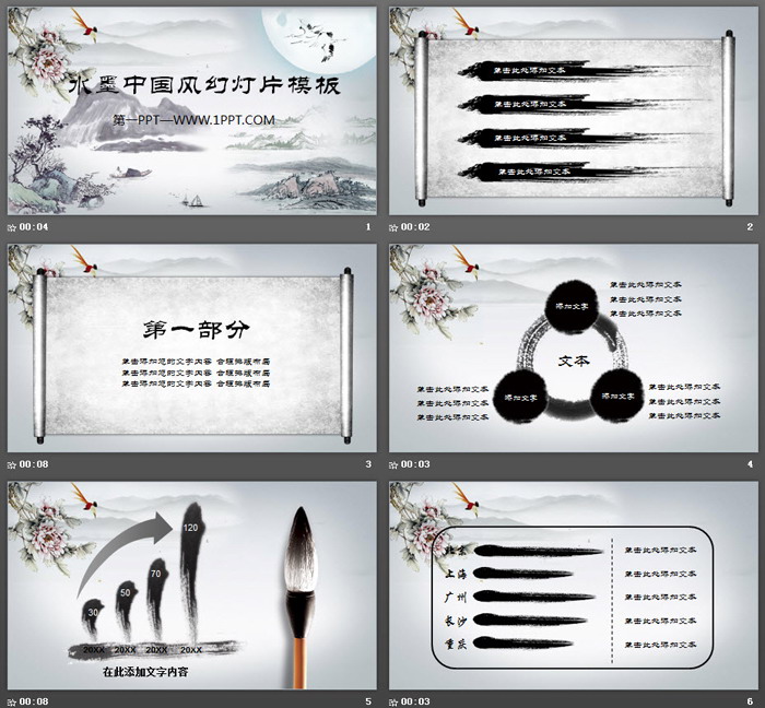 关键词:卷轴、毛笔、古代文人、山水画幻灯片背景图片,黑色毛笔墨迹PPT图表,水墨中国风PowerPoint模板免费下载,.PPTX格式;