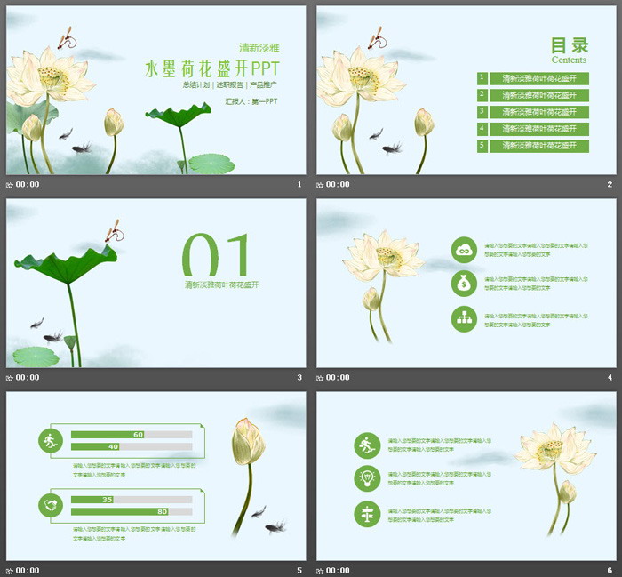 这是一套绿色清新雅致的,水墨荷花盛开PPT模板,共26张;