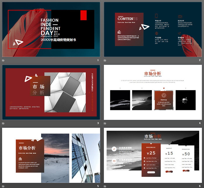 PowerPoint模板内容页,由24张红色、黑色、灰色搭配的幻灯片图表制作。另外使用了多张时尚潮流产品作为背景素材排版编辑。
