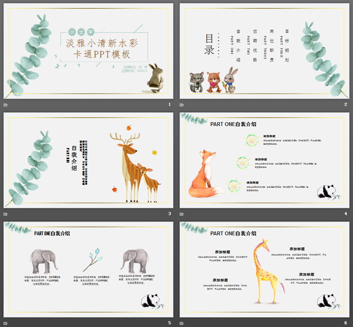 PPT模板内容页,使用了各种可爱水彩手绘小动物,与内容文字进行排版。包括:大熊猫、梅花鹿、小猪、大象、长颈鹿等。