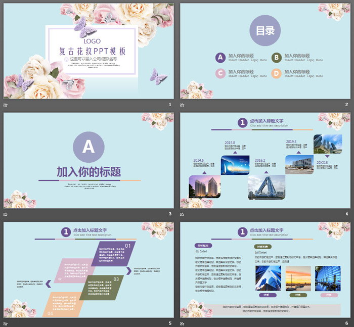 关键词:蝴蝶、月季花、花卉、植物PPT模板,清新复古艺术设计幻灯片模板免费下载,.PPTX格式;
