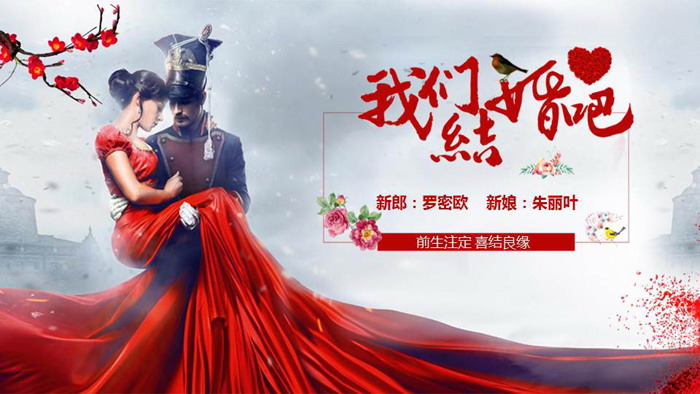 幻灯片模板封面,使用了一张复古风格的婚纱照作为背景图片。周围使用腊梅、玫瑰爱心等元素装饰。右侧使用我们结婚吧艺术字作为PPT标题,下方填写新娘新郎的名字。