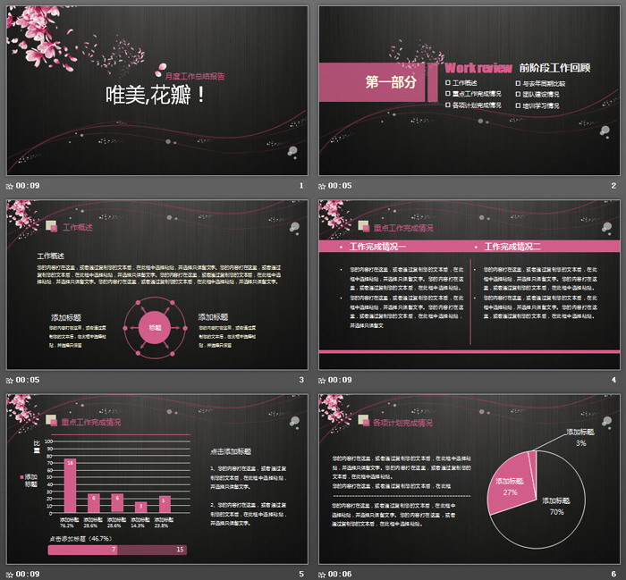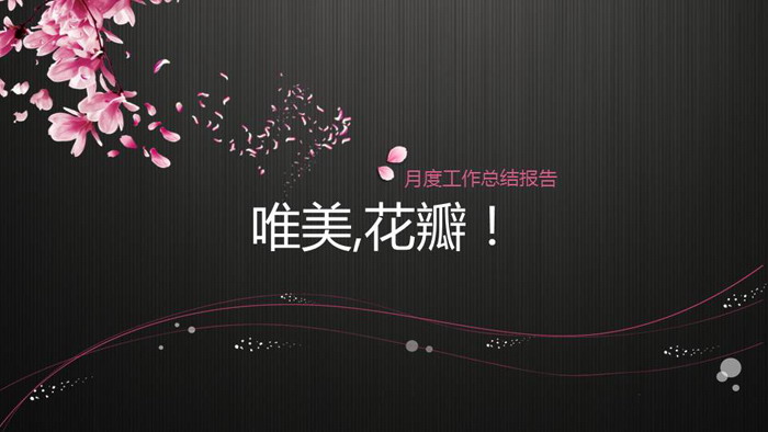 幻灯片模使用了一张黑色渐变图片作为底图。PPT模板封面,使用了曲线、粉色桃花以及花瓣作为背景图片。中间使用粉色与白色字体搭配填写PPT标题文字。界面设计清新唯美。