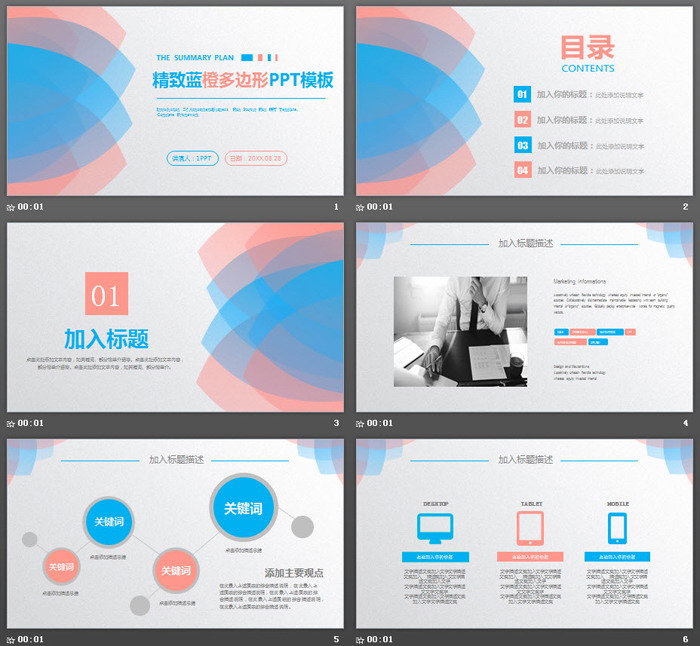 PowerPoint模板内容页,由25张蓝色橙色搭配的扁平化幻灯片图表制作。本模板适合用于制作各类商务演示PowerPoint。