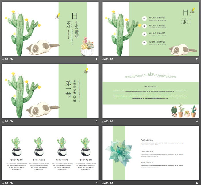 关键词:绿色清新日式PPT模板,猫咪、仙人掌、多肉植物幻灯片背景图片,可爱卡通PowerPoint模板免费下载,.PPTX格式;