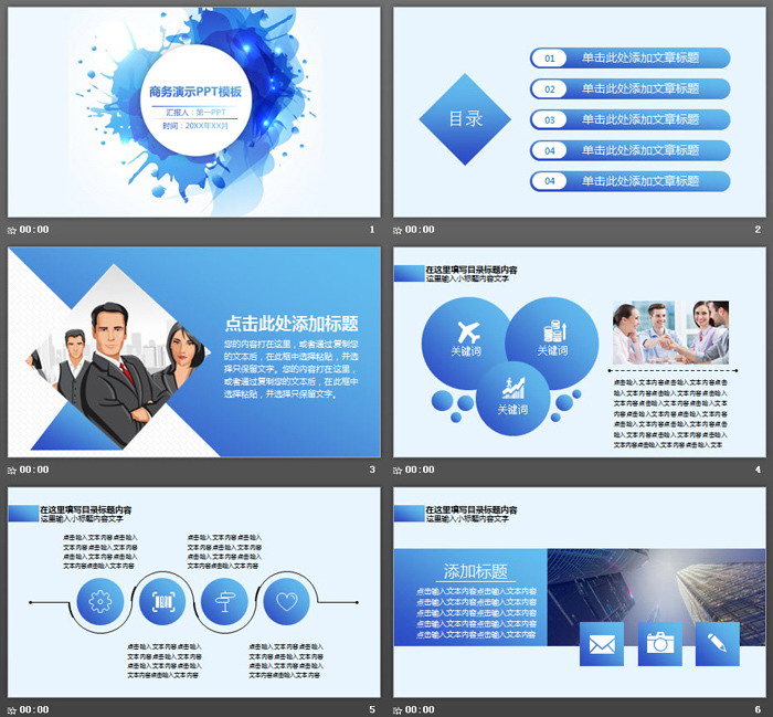 这是一套简洁蓝色墨迹背景商务PPT模板,共29张;