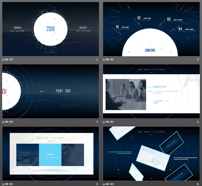 幻灯片模板封面,使用了半透明的云海图片作为底图。上面使用蓝色半透明遮罩图层蒙版,搭配白色圆形动画,制作出炫酷的星空效果。