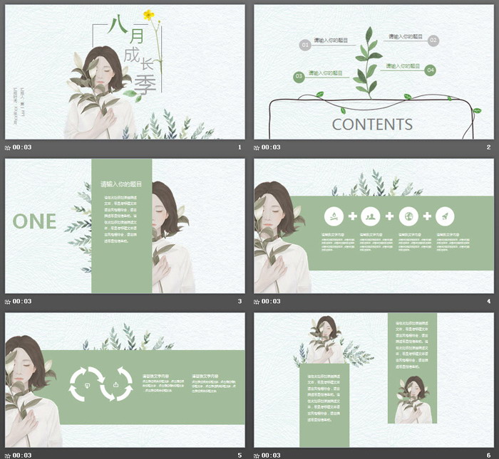 幻灯片模板封面,使用了一张手拿花枝的绿色唯美插画作为背景图片。上方使用“八月成长记”艺术字作为PPT标题。界面设计清新唯美。