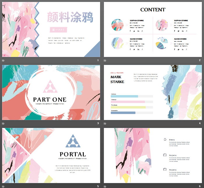 幻灯片模板,使用了多张彩色颜料笔触图案作为背景图片。各种没有约束的涂鸦造型设计。整个模板设计非常具有创意。幻灯片内容页使用了橙色图表搭配英文字体设计制作。