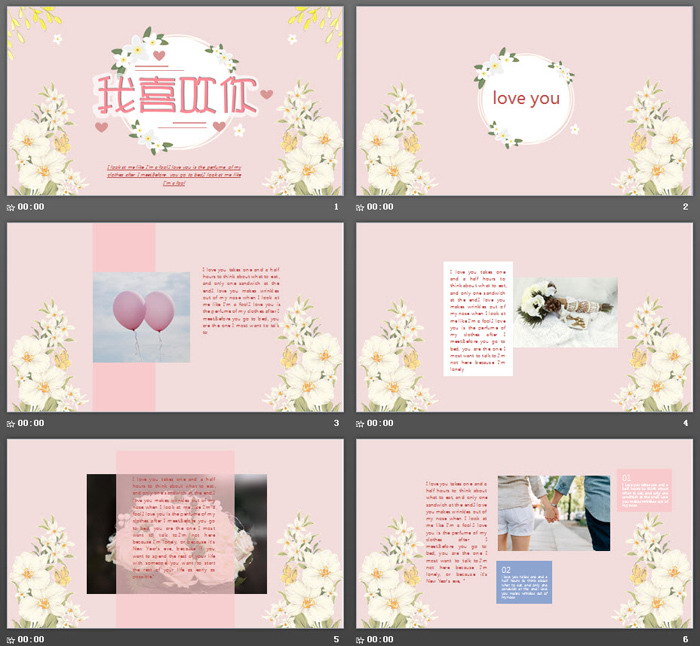 幻灯片模板使用了浪漫粉色作为主题色。PPT模板封面,放置了白色清新花卉、粉色爱心作为背景图片。中间使用小清新字体填写 我喜欢你PPT标题文字。