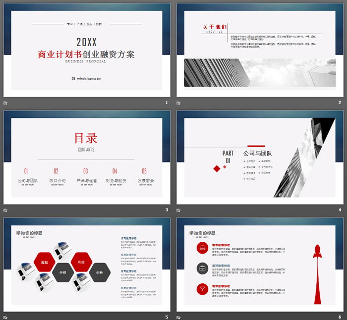 PowerPoint模板内容页,由38张红灰配色的扁平化幻灯片图表制作。另外使用了商业建筑、办公场景等图片进行排版。