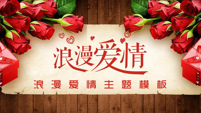 幻灯片模板,使用了棕色木纹与红色玫瑰花作为背景图片。中间放置一张古典纸张底图,上面放置 浪漫爱情 PPT艺术字。周围用红色爱心图案装饰。界面设计非常浪漫。