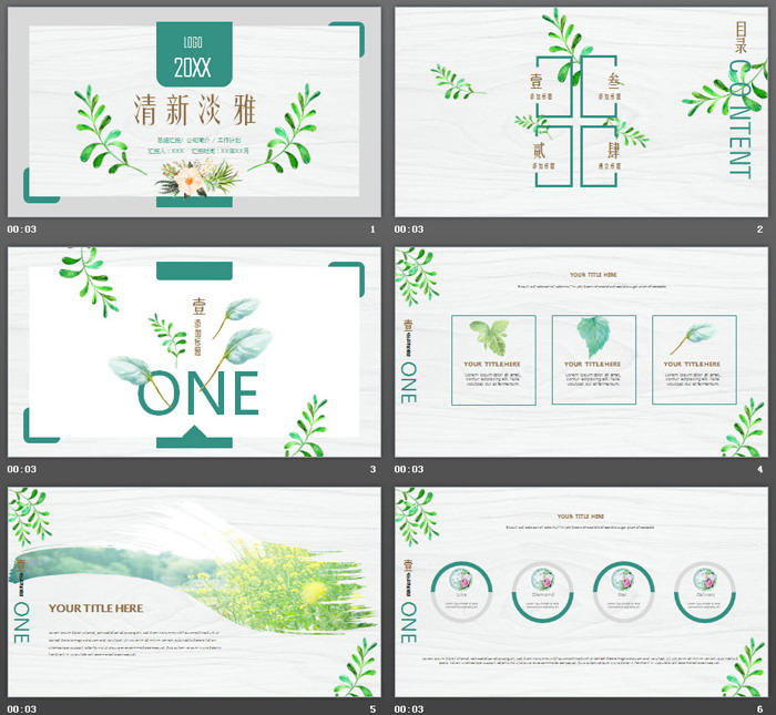 幻灯片模板使用了一张淡雅木纹图片底图。PPT首页,放置了绿色手绘叶子和鲜花图案。中间填写PPT标题文字。界面设计清新简洁。