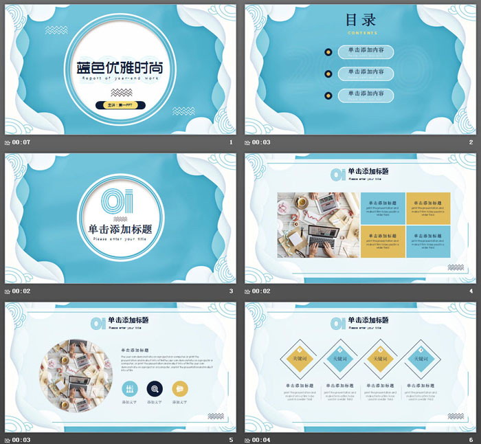 这是一套蓝色优雅时尚艺术PPT模板,共30张;