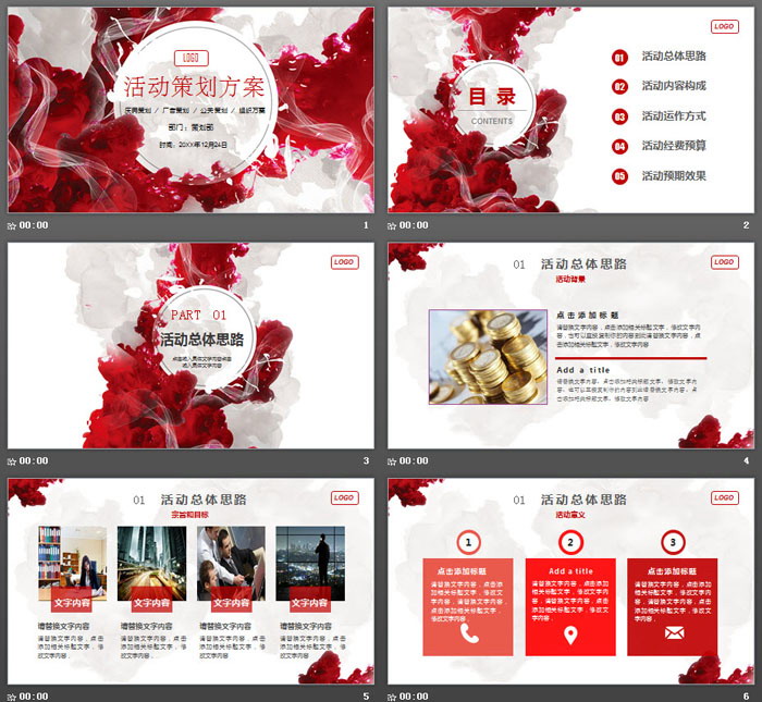 这是一套时尚红色油漆颜料背景的,活动策划方案PPT模板,共24张;
