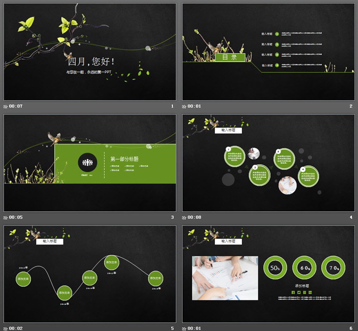 这是一套简洁藤蔓植物背景的,四月主题PPT模板。共25张;