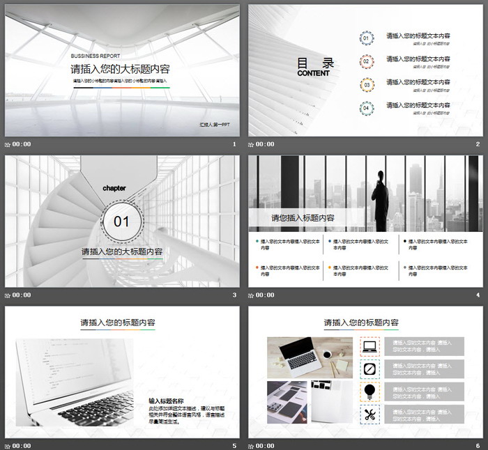 PowerPoint模板内容页,由24张彩色动态扁平化幻灯片图表制作。另外使用了与封面类似的旋转楼梯建筑图片作为背景图。另外PPT模板使用了多张职场白领、办公场景、手机等插图排版。