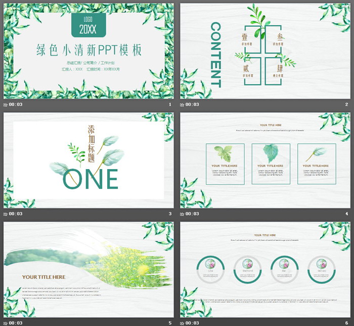 幻灯片模板封面,使用了绿色植物叶子PPT背景图。中间填写PPT标题文字。界面风格非常清爽,给人小清新的感觉。