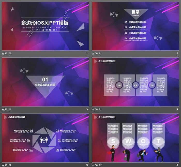 这是一套紫色低平面多边形背景的,iOS风格PPT模板,共27张;