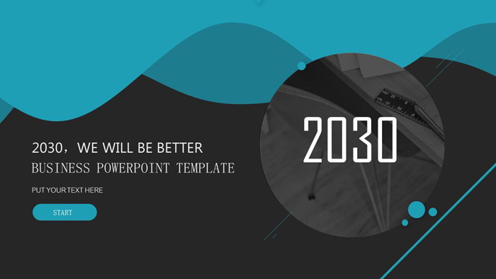 PPT模板封面,使用了黑色底色,蓝色动感曲线背景图片。左侧填写商务汇报PPT标题文字。右侧圆形可以放置logo或填写汇报时间等信息。界面动感不失商务风格。