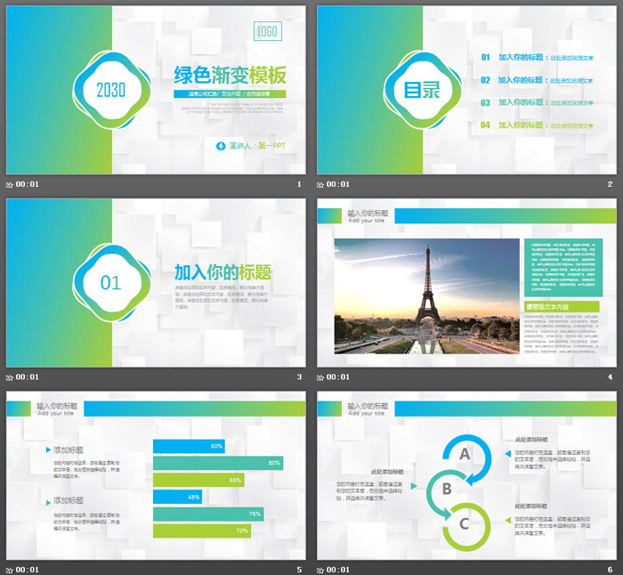 这是一套绿色渐变设计的,简洁商务PPT模板,共26张;